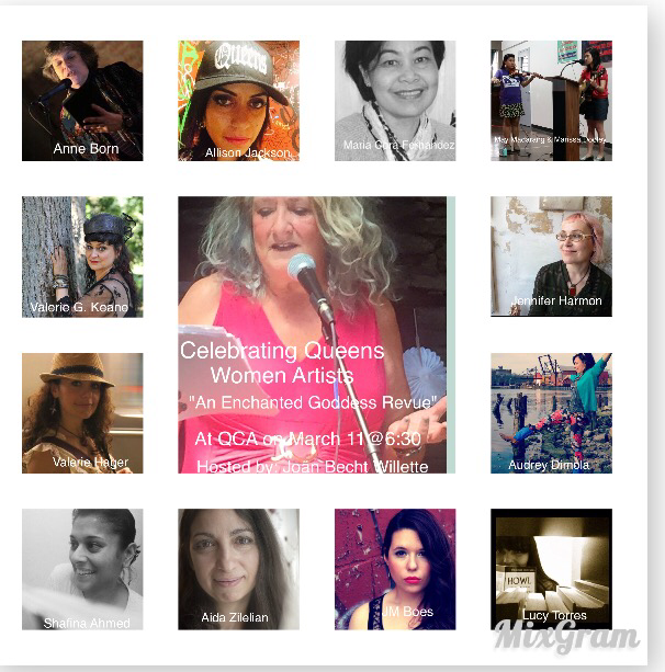 Debut of “Celebrating Queens Women Artists” curated and hosted by Joan Becht Willette. This is part of her new “The Enchanted Goddess Revue” performance series. March 2016